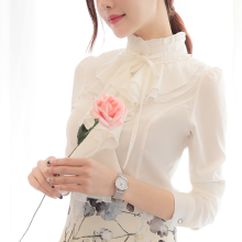 雪纺白衬衫女长袖韩范衬衣修身女装荷叶边学院风雪纺春职业打底衫