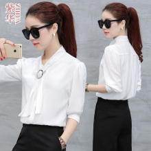 系带V领雪纺白色衬衫女长袖韩范2017春装新款气质衬衣泡泡袖小衫