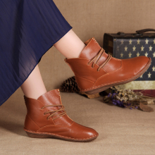 真皮软底系带女短靴平底休闲女鞋春秋圆头女单靴头层牛皮复古女靴