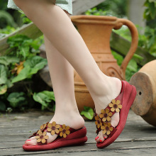 民族风手工牛皮露趾坡跟一字女拖鞋平底高跟花朵凉拖鞋真皮女鞋夏