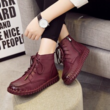 真皮软底大码女靴春秋系带女短靴牛皮平底女单靴圆头复古休闲女鞋