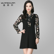 逸朗轩春装新款女装长袖领口系带雪纺长袖大码印花修身连衣裙女