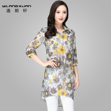 逸朗轩春装新款女装印花棉衬衫中长款女气质大码七分袖花色衬衣薄