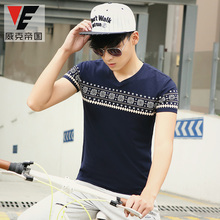 威克帝国 男士短袖t恤2016夏季新款民族风印花T恤V领短袖男装t恤