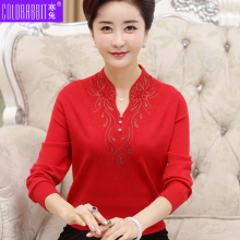 中老年女装春装针织衫长袖妈妈装旗袍领打底衫上衣中年毛衣女春秋