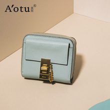 奥图新款真皮拉链钱包女士短款头层牛皮钱夹两折欧美锁扣零钱包潮