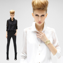 COCOBELLA2017春季新品长袖立领不对称下摆女黑色雪纺衬衫KT3
