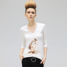 【2件259】COCOBELLA 春装手绘印花女修身显瘦V领印花打底T恤TE97