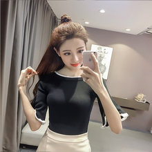 荷叶边喇叭袖短袖t恤女夏季韩版学生五分袖上衣女修身冰丝针织衫