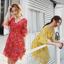 薇娅viya夏装新款V领五分荷叶袖大摆裙复古碎花雪纺连衣裙女裙子