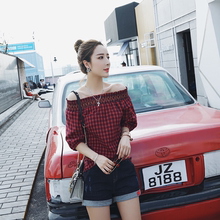 薇娅viya夏装新款五分袖红格子衬衫显瘦性感衬衣一字领露肩女上衣
