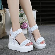 2017夏季新款女坡跟凉鞋魔术贴厚底防水台松糕女鞋韩版亮片高跟鞋