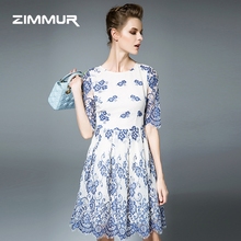 ZIMMUR2016秋装新款连衣裙短袖中腰气质中裙青花瓷绣花蕾丝裙子