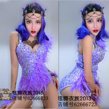 新款酒吧ds演出服夜店领舞服性感dj爵士舞台装紫色羽毛满钻连体衣