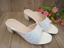 2016新款凉鞋女夏中跟亮片韩版一字拖粗跟女士凉拖鞋时尚高跟女鞋