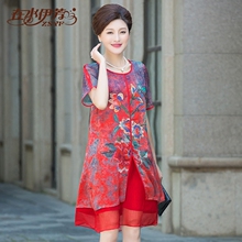 中老年女装夏季中长款雪纺连衣裙假两件中年胖妈妈装夏装裙子大码