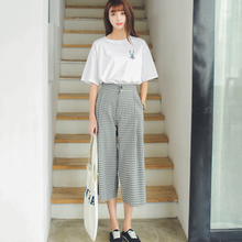 定格,高腰格子七分阔腿裤女夏季韩版复古文艺宽松显瘦九分直筒裤