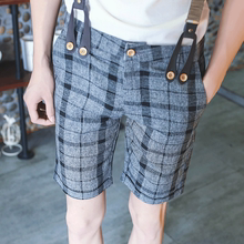夏季条纹修身短裤男时尚潮小清新格子可拆卸背带裤小西装裤五分裤