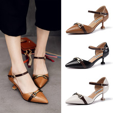17春新款欧美英伦复古OL搭扣细跟高跟鞋一字扣中跟尖头单鞋工作鞋