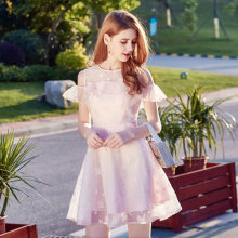 夏季连衣裙女短袖露肩2017新款名媛气质淑女镂空蕾丝修身a字裙子