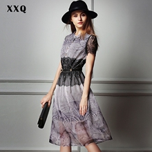 XXQ2017夏季新款蕾丝拼接气质a字裙雪纺水墨印花连衣裙中长款修身