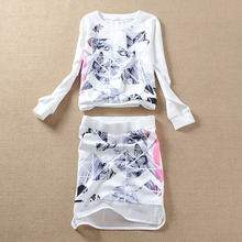 欧洲站2017新款时尚女装圆领印花气质休闲时髦套装两件套秋款套裙