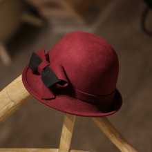 秋冬礼帽女士双色立体蝴蝶结卷边毡帽圆顶复古优雅斜边纯羊毛帽子