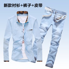 春秋季男装韩版牛仔套装休闲长袖衬衫和牛仔长裤子男士潮流两件套