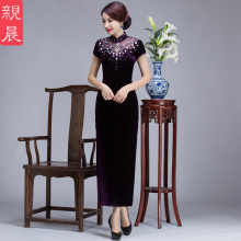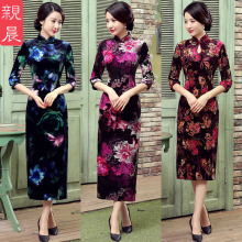 丝绒旗袍春夏装婚礼服妈妈装长袖时尚改良中长款中老年女装连衣裙