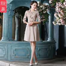 亲晨2016新款旗袍裙上衣秋装日常复古短款改良棉麻短袖连衣裙女士