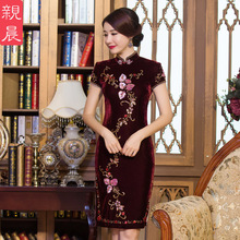 金丝绒旗袍短款长袖婚礼服婚宴妈妈装春夏装复古改良中老年连衣裙