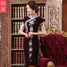 金丝绒旗袍裙连衣裙长袖中长款婚礼服妈妈装大码春夏装中老年改良