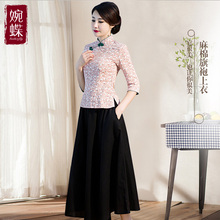 棉麻旗袍连衣裙上衣春装改良时尚少女七分袖旗袍裙春款中袖女春夏