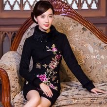 秋冬旗袍2016冬季新款长袖毛呢复古刺绣日常修身女改良旗袍连衣裙