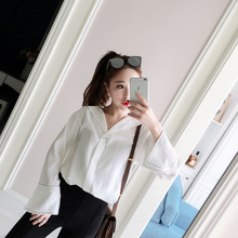 v领喇叭袖雪纺白衬衫女装长袖2017春装新款白色衬衣韩版宽松显瘦