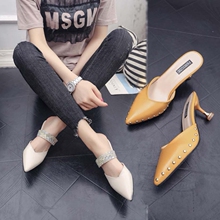 2017韩版新款尖头高跟凉鞋细跟性感凉拖时尚铆钉一字带半凉拖鞋女