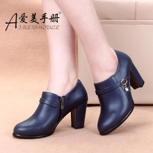 爱美手册春秋新款真皮女鞋水钻单鞋女侧拉链防水台高跟鞋粗跟鞋子