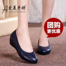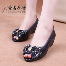 爱美手册夏季新款中跟妈妈鞋真皮软底坡跟水钻单鞋浅口蝴蝶结女鞋