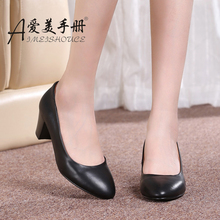 爱美手册牛皮工作鞋女黑色中跟单鞋职业鞋粗跟大码女鞋41码小码33