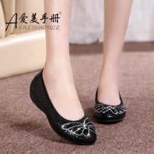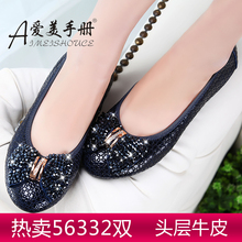 爱美手册春季女鞋子蝴蝶结水钻单鞋平跟平底鞋头层牛皮妈妈鞋41码