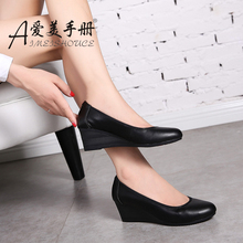 真皮坡跟单鞋女黑色圆头职业女鞋浅口小码高跟鞋32 33舒适工作鞋
