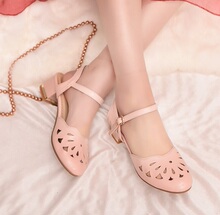2017新款凉鞋女夏一字扣带粗跟中跟镂空包头女鞋圆头洞洞鞋大小码