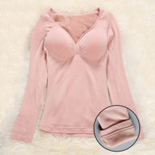 日本冬季长袖保暖内衣女加厚加绒袖子塑身V领低领单件带胸垫上衣