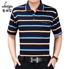 夏季中年男士短袖T恤男40-50岁中老年宽松翻领上衣薄款条纹体恤衫