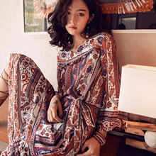 娇澜复古民族风印花连衣裙夏女裙七分喇叭袖泰国沙滩裙度假海边裙