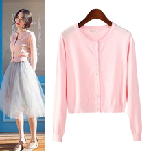 2017春季高腰短款纯色简约修身针织开衫长袖圆领薄针织衫薄开衫女