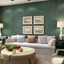 复古墨绿色田园树枝叶无纺布墙纸 美式乡村卧室客厅背景墙壁纸