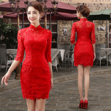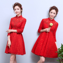 新娘敬酒服旗袍春季2017新款红色短款修身中袖改良中式结婚礼服女