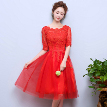 敬酒服新娘短款2017新款春夏红色中袖蕾丝结婚晚礼服连衣裙修身女