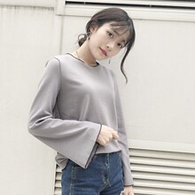 兔二哥秋冬韩版风简约撞色包边喇叭袖套头打底针织T恤上衣